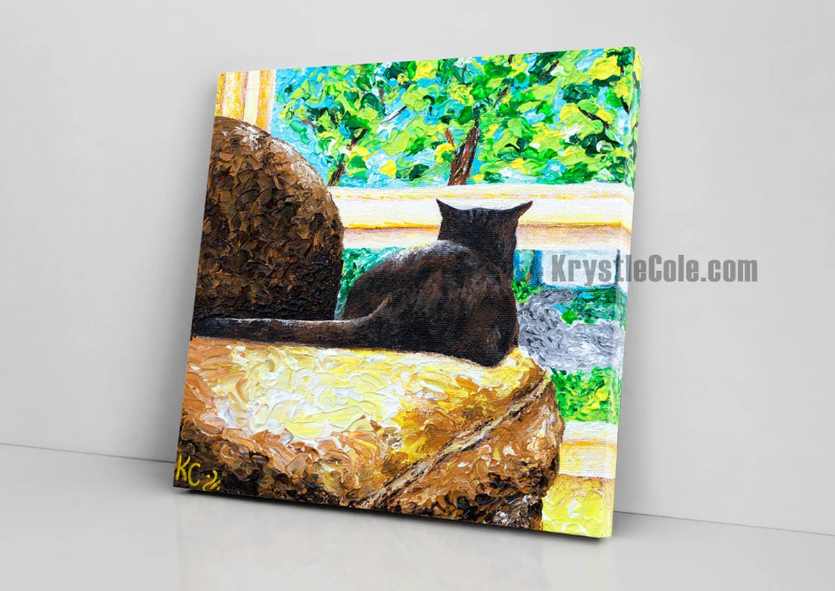 This fine art print of my cat painting entitled Cat TV is a portrait of my cat, Mr. Samadhi, as he watches the happenings of the world outside through our living room window. It is a great cat lover gift...and it is available on paper or ready-to-hang canvas!