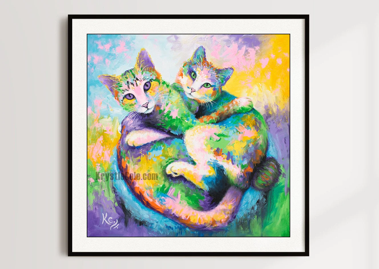 This is a fine art print on paper or ready-to-hang canvas of my rainbow cat painting entitled Brothers. The two cats cuddling in the painting are my cats, Mr. Samadhi (a tabby) and Panda Bear (a manx). This colorful wall art would make a purr-fect addition to anyone's home, especially if you're into cat art, cat paintings, cat wall decor, or if you need a fun cat lover gift!