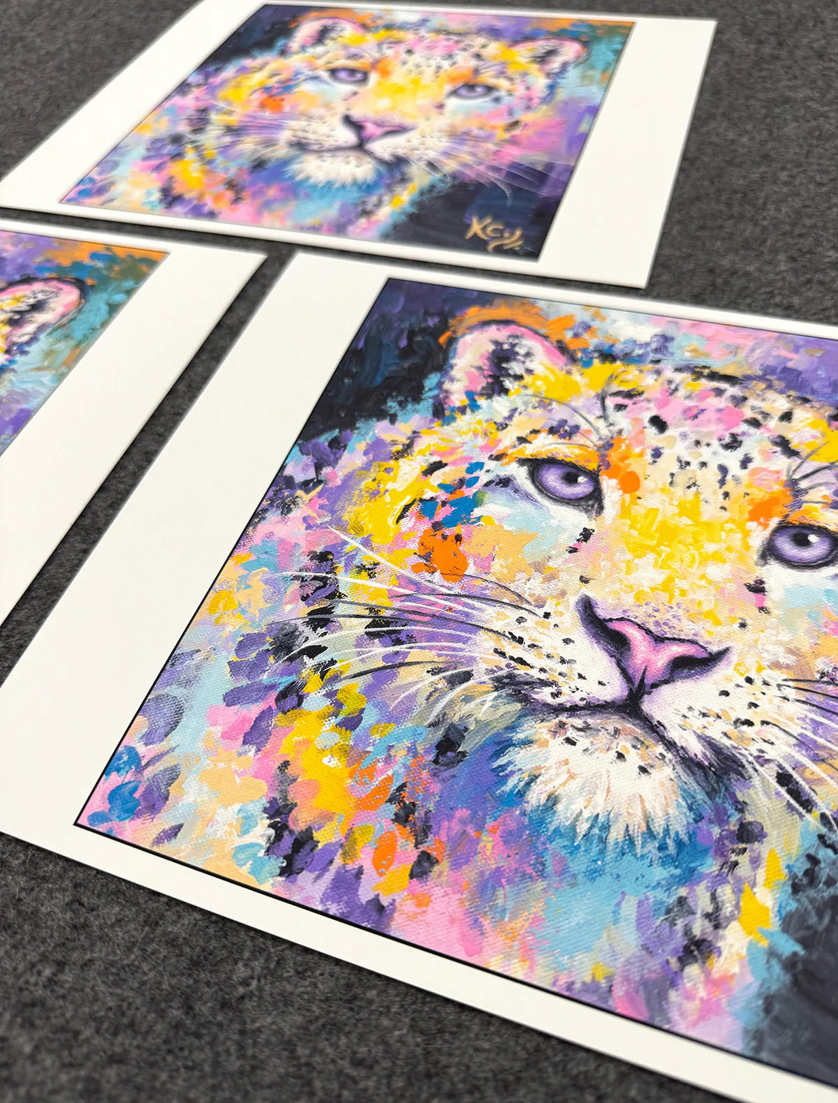 This is a fine art print on paper or ready-to-hang canvas of my snow leopard painting entitled Rainbow Snow Leopard. I created this piece as part of my The Spirit Within collection, released in early 2025.