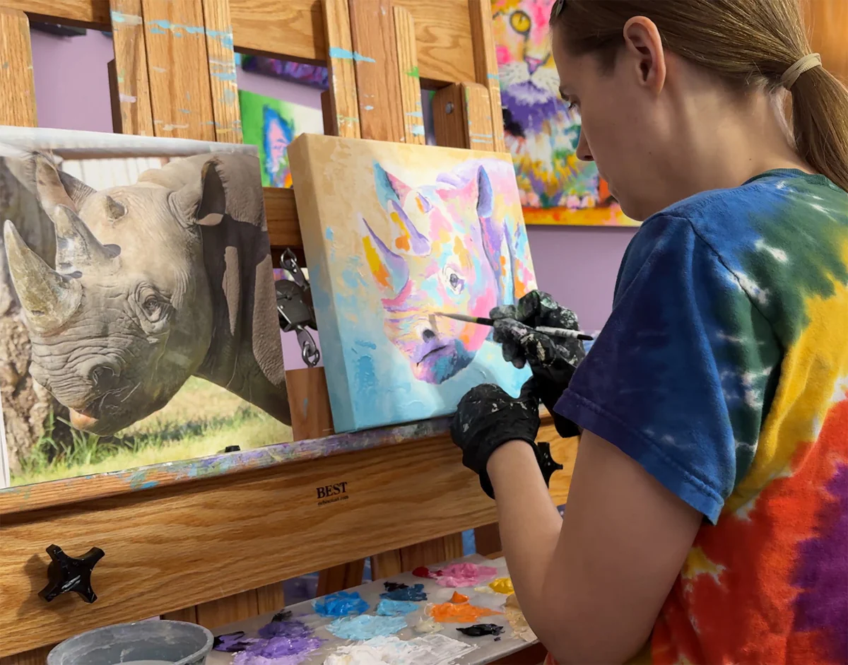 This is a fine art print on paper or ready-to-hang canvas of my rhino painting entitled KJ with Three Horns. I created this piece as part of my The Spirit Within collection, released in early 2025.