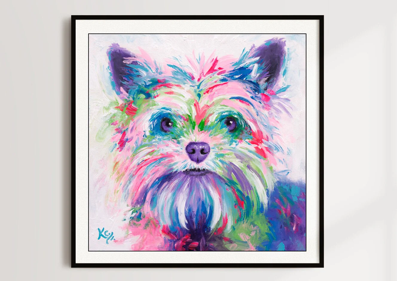 Add a pop of color to your walls with this beautiful fine art print of my rainbow yorkie / yorkshire terrier painting. It is available on paper or ready-to-hang canvas and is fun dog lover gift!